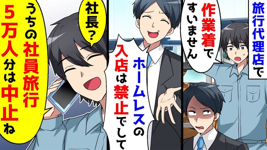 旅行代理店に作業着で行くとホームレスとみなされ追い出された。すぐにある人に電話したら