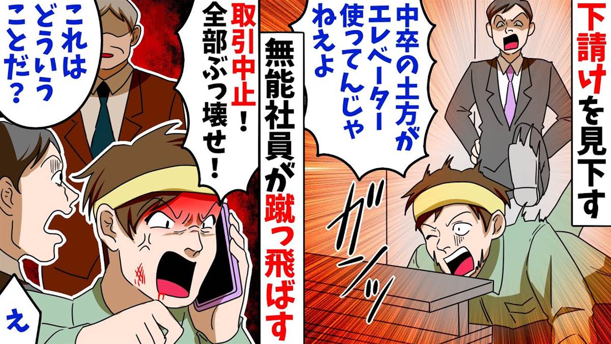 下請けを見下すエリート気取りの無能社員が蹴っ飛ばす『中卒の土方がエレベータ使ってんじゃねよ』すると、社長『取引中止!全部ぶっ壊せ!』DQN『え!?』→結果【スカッとする話】【スカッとする話】【アニメ】