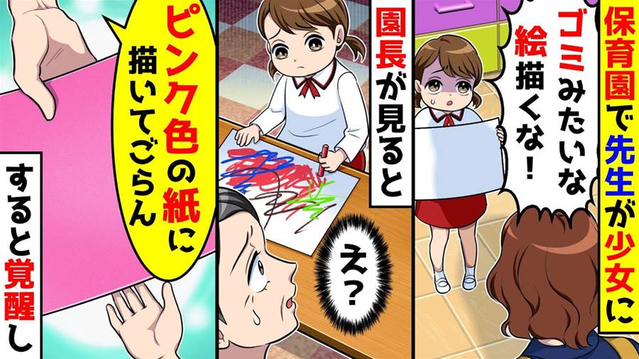 保育園で絵を描いている少女にピンク色の紙を渡すと