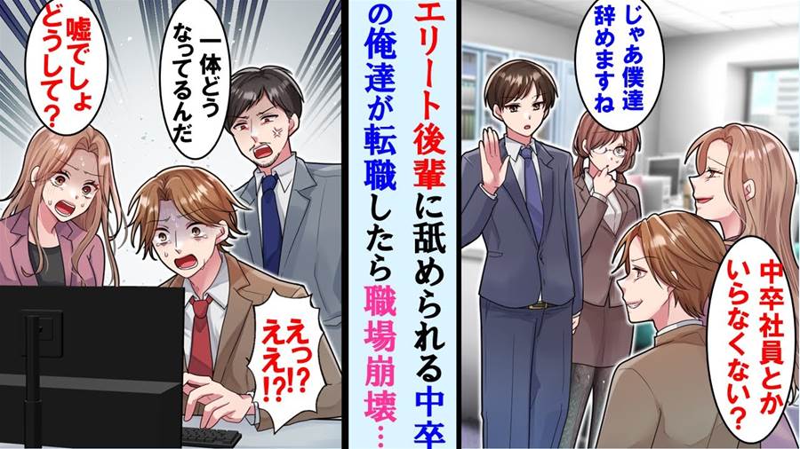 【漫画】中卒の俺達をなめる大卒エリート後輩が嫌で転職したら前職場が大混乱→元上司「お前ら何でアイツらが中卒か知らないのか!」エリート後輩「えっ⁉」実は俺達は…