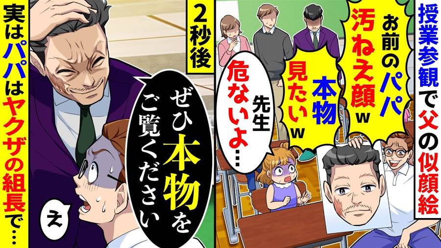 授業参観で母が来てると勘違いした先生。顔に傷がある父の似顔絵をバカにするが、パパはヤクザの組長で