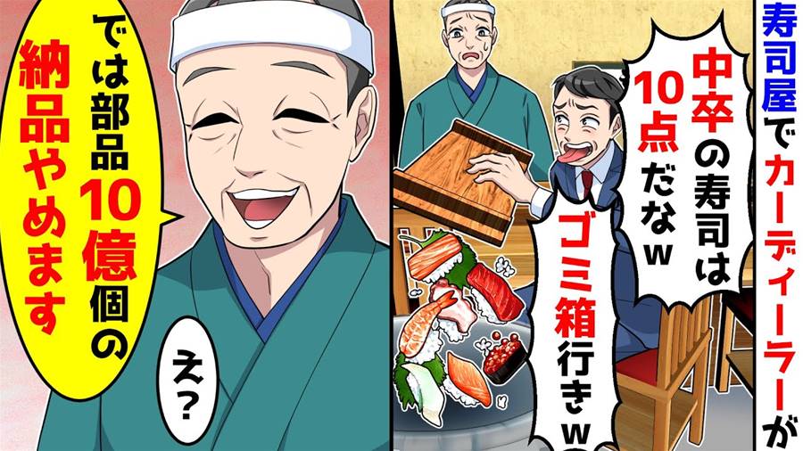 高級寿司屋でカーディーラーが中卒の寿司は10点だとゴミ箱に捨てた。すると大将が部品10億個の納品やめると言い始め