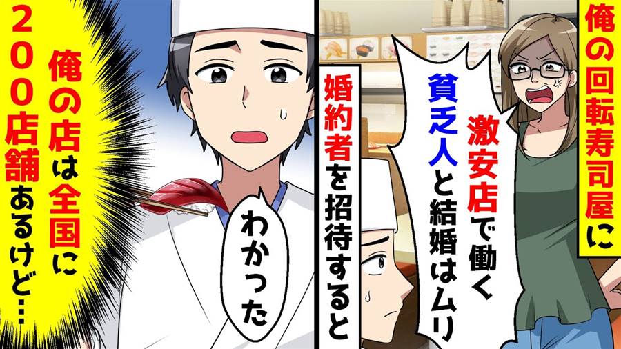 俺の回転寿司屋に婚約者を招待したら激安店で働く貧乏人と結婚は無理と言われた。全国に200店舗あるのに