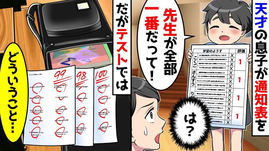 天才の息子が通知表を持ってきたが全て1。だが、テストの点数は