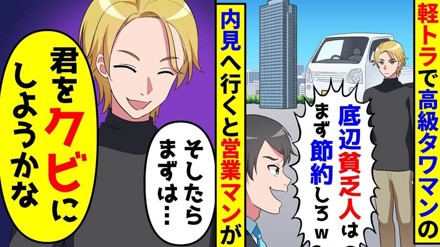 軽トラで高級タワマンの内見へ行くと営業マン「底辺貧乏人はまず節約しろよw」→「じゃあ君をク●にしようかな」
