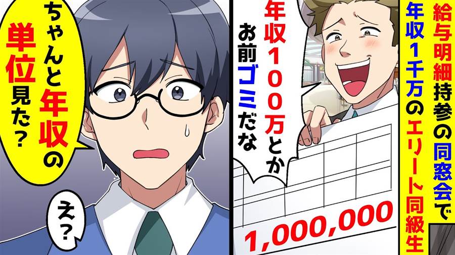 給与明細持参の同窓会で年収1千万のエリート同級生が俺の明細を取り上げ年収100万はゴミと言ってきた。しかし俺の年収の単位は円ではなく