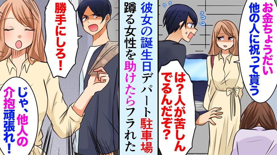 【漫画】デート中に女性を助けたらモデル志望の彼女激怒「お金だけ頂戴!他の人に祝ってもらう!」→数日後、別れた彼女から連絡「助けて!」女性の正体が…【マンガ動画】
